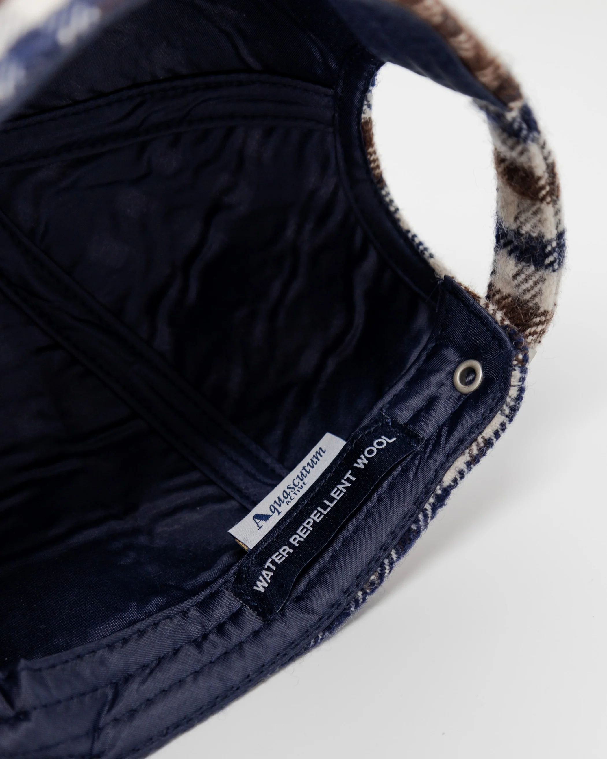Berretto baseball in tessuto 100% Merino, smacchinato in Club Check, trattato con una leggera resinatura a spray per creare la caratteristica di articolo repellente all’acqua. Etichetta tessuto posizionata sul lato interno.