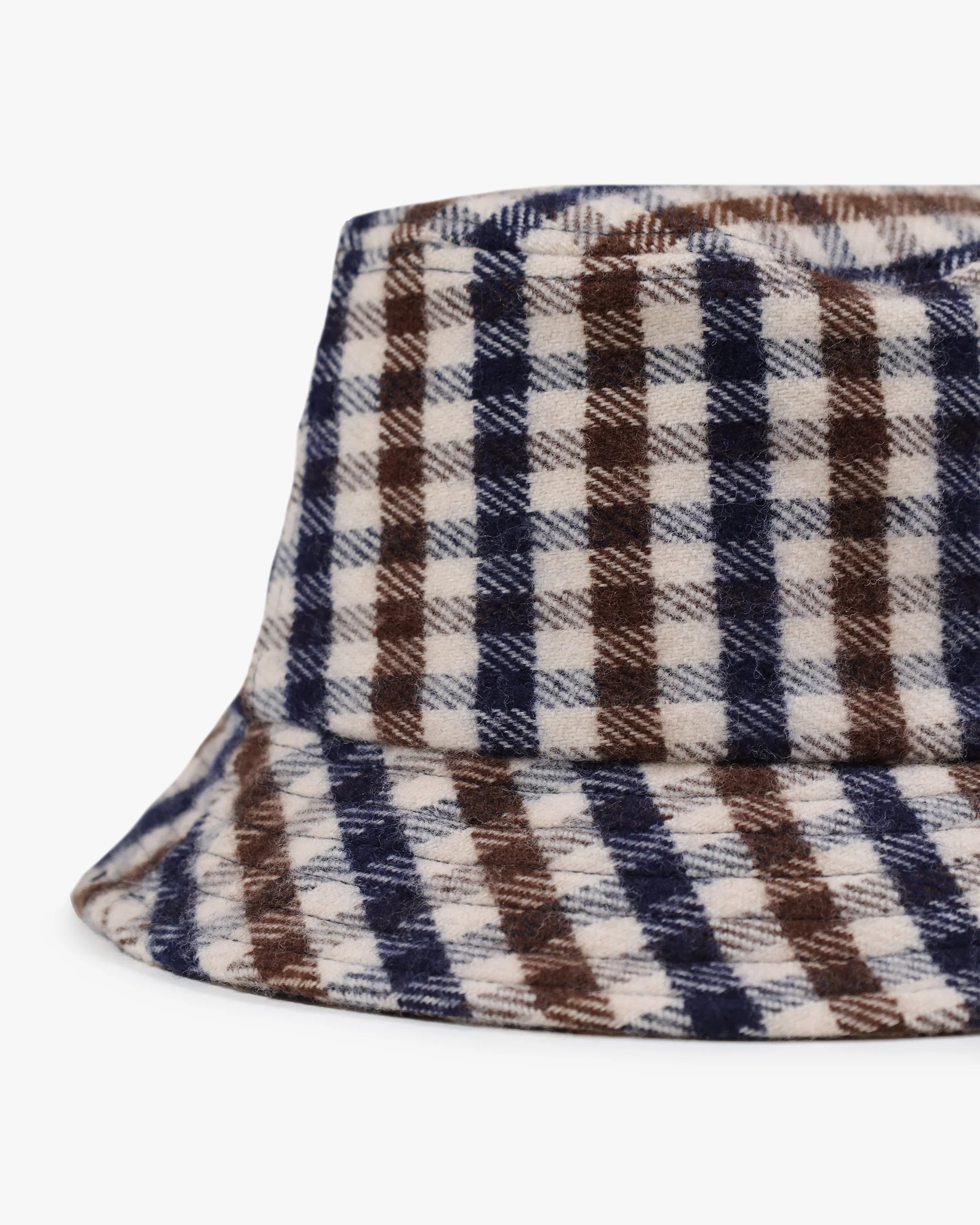 Bucket Hat in tessuto 100% Merino, smacchinato in Club Check, trattato con una leggera resinatura a spray per creare la caratteristica di articolo repellente all’acqua. Etichetta tessuto posizionata sul lato interno.