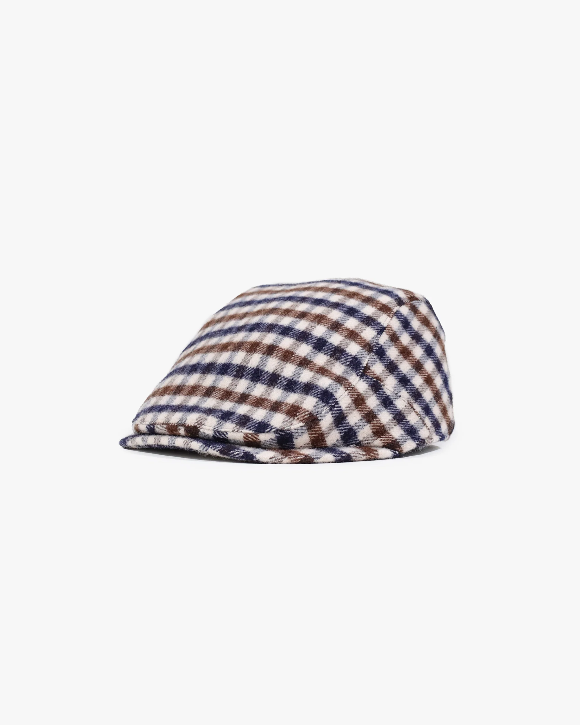 Scoppola in tessuto 100% Merino, smacchinata in Club Check, trattata con una leggera resinatura a spray per creare la caratteristica di articolo repellente all’acqua. Etichetta tessuto posizionata sul lato interno.
