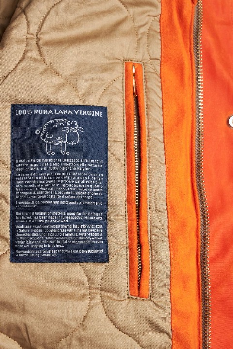 Il corpo è foderato in cotone trapuntato ed imbottito con ovatta di lana, le maniche sono foderate in cupro ed imbottite con ovatta in lana proveniente da pecora allevata in Italia.